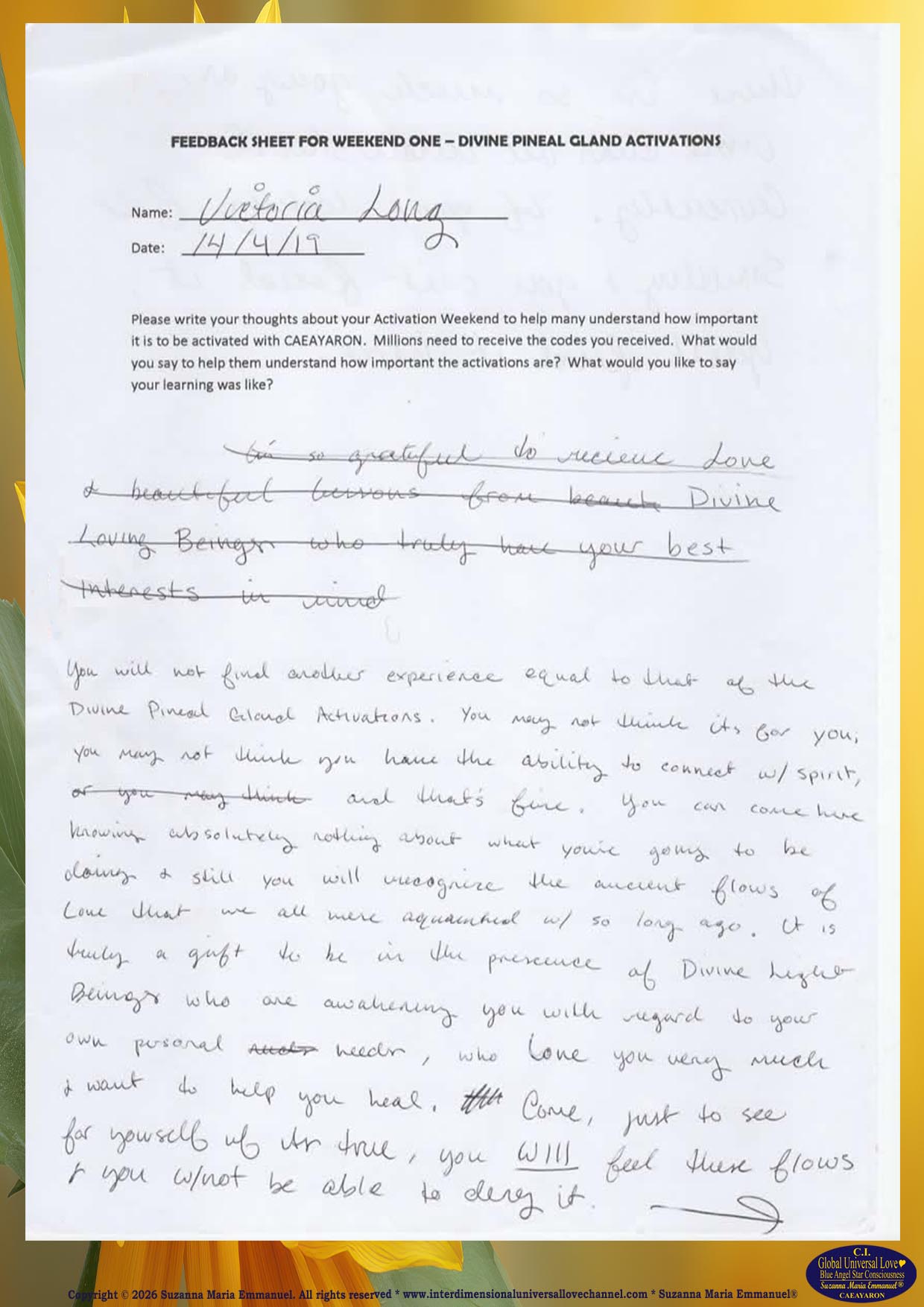 22. Testimony from Victoria: The Divine and Universal Love Pineal Gland DNA Activation Events: April 2019, page 2.