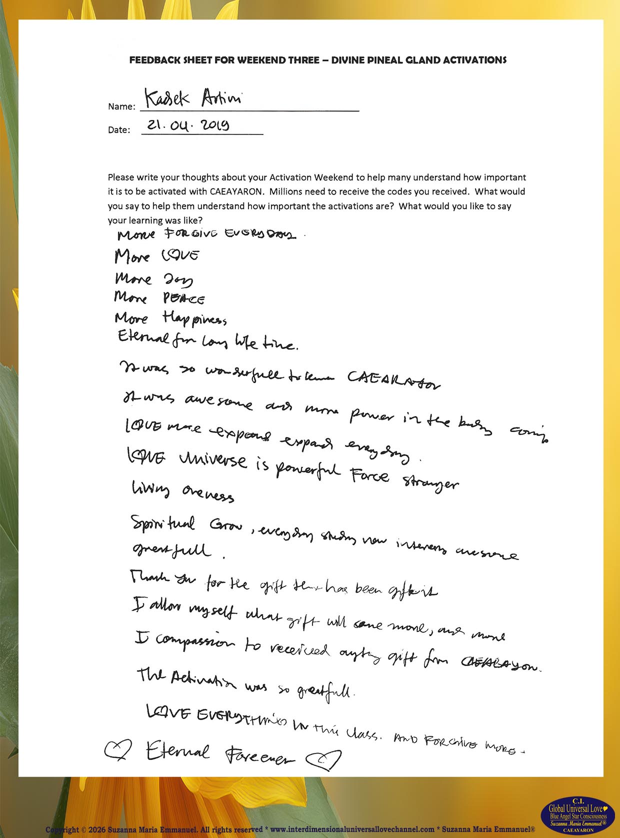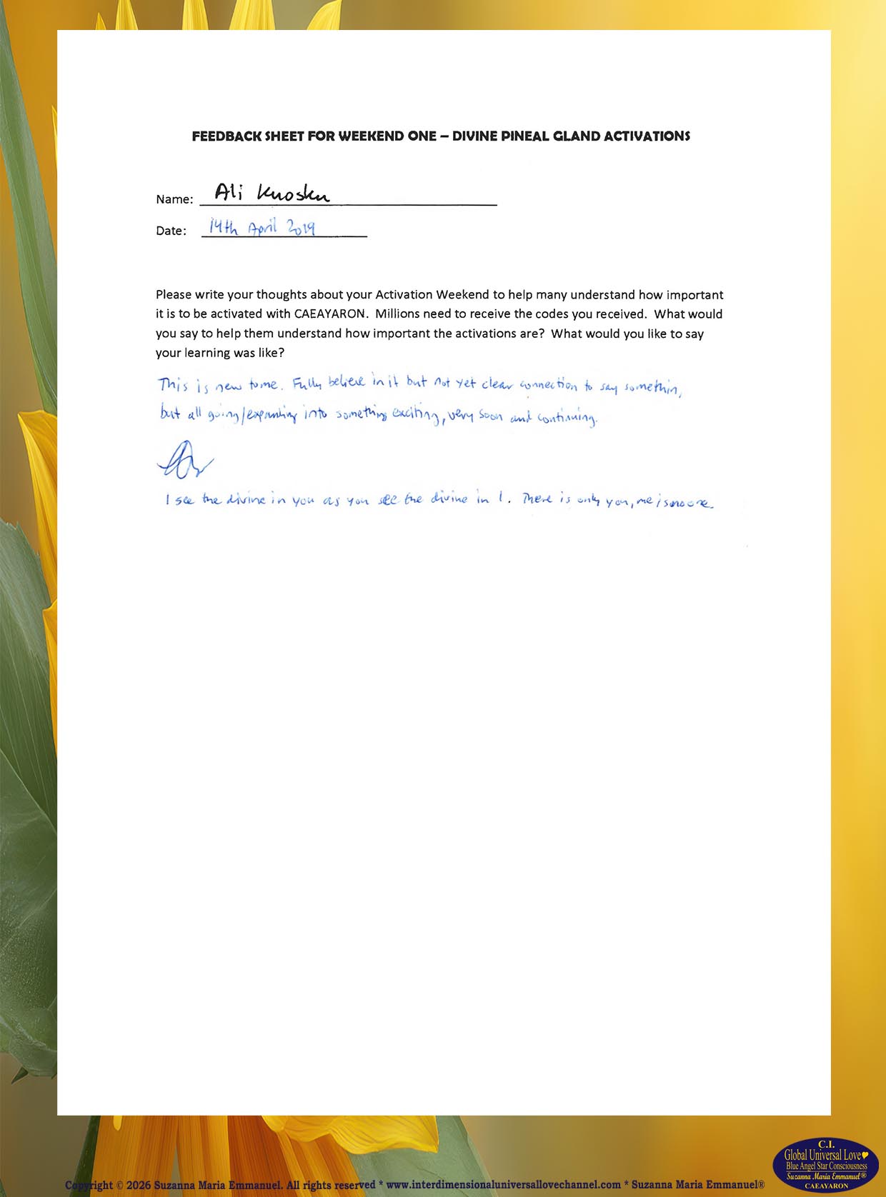 60. Testimony from Ali: The Divine and Universal Love Pineal Gland DNA Activation Events: April 2019.