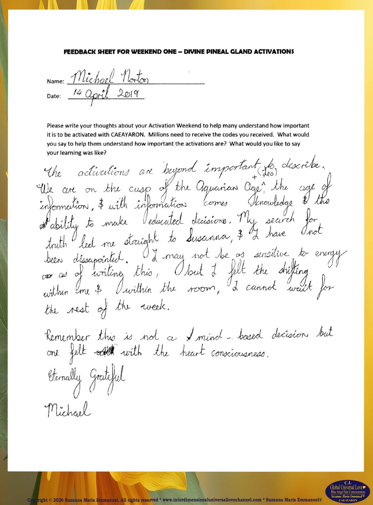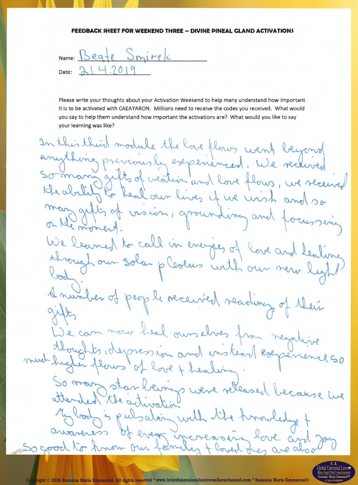62. Testimony from Beate: The Divine and Universal Love Pineal Gland DNA Activation Events: April 2019, Page 1.