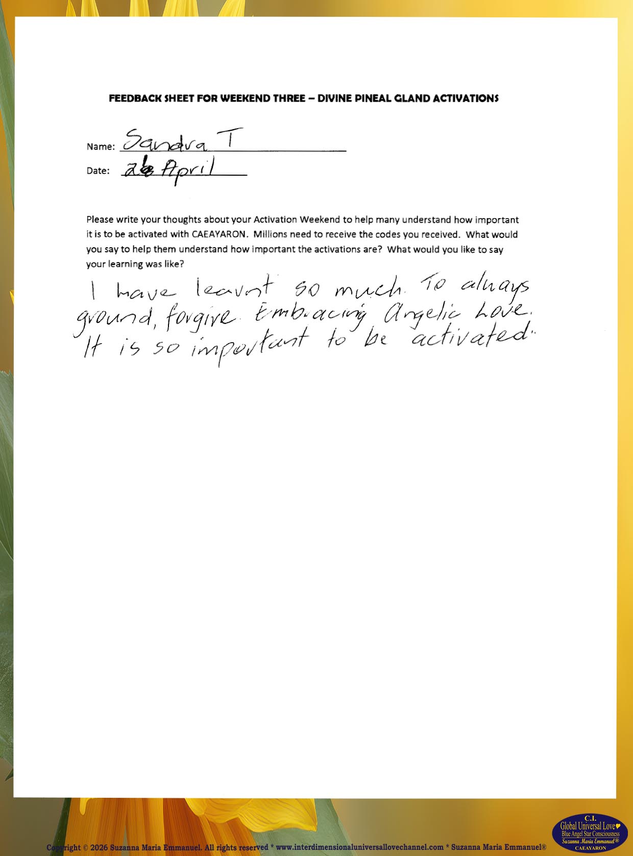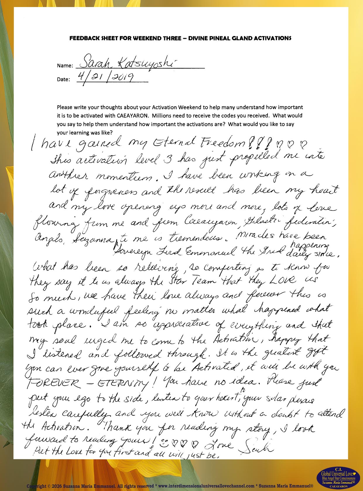 65. Testimony from Sandra T: The Divine and Universal Love Pineal Gland DNA Activation Events: April 2019.