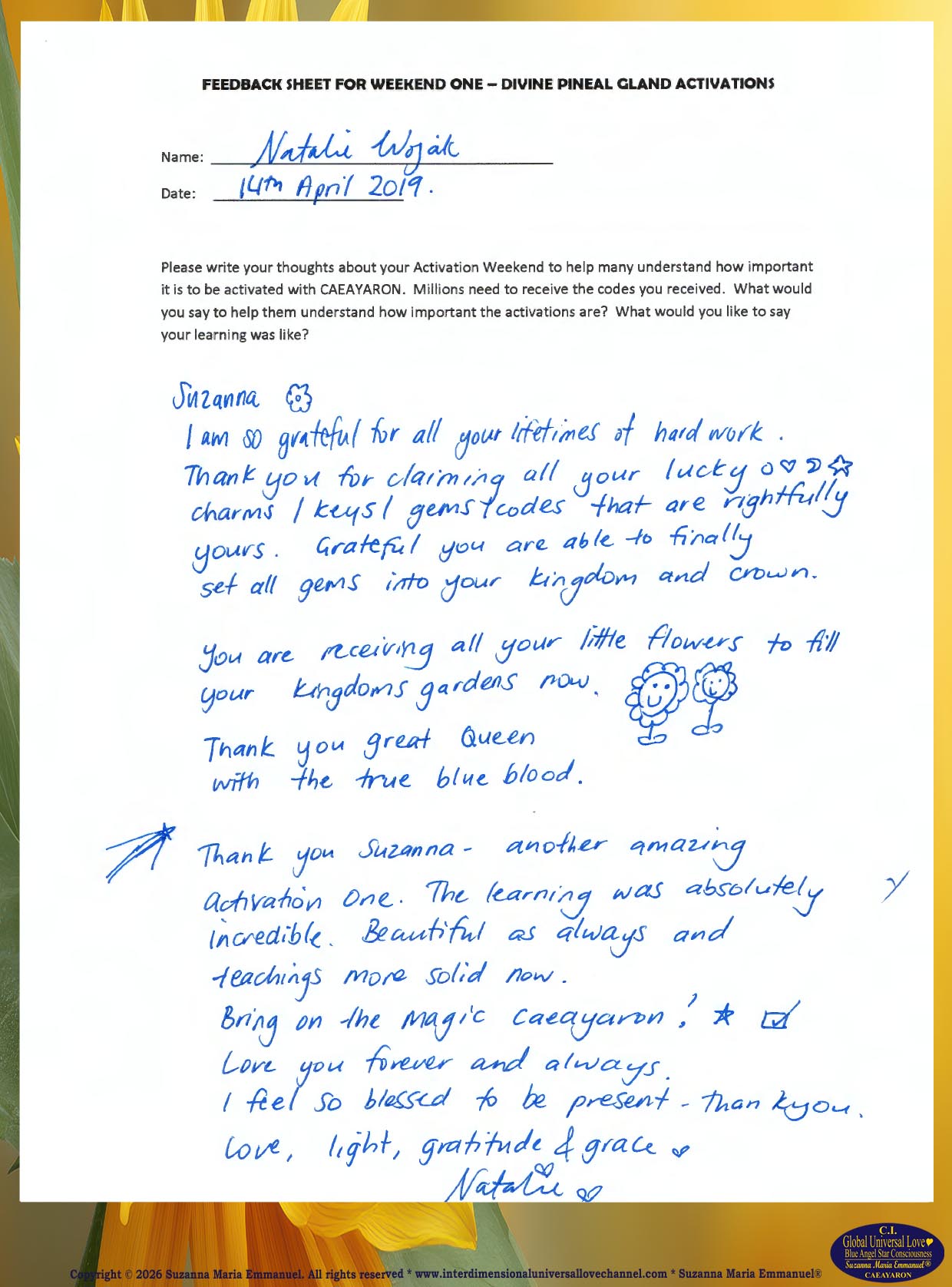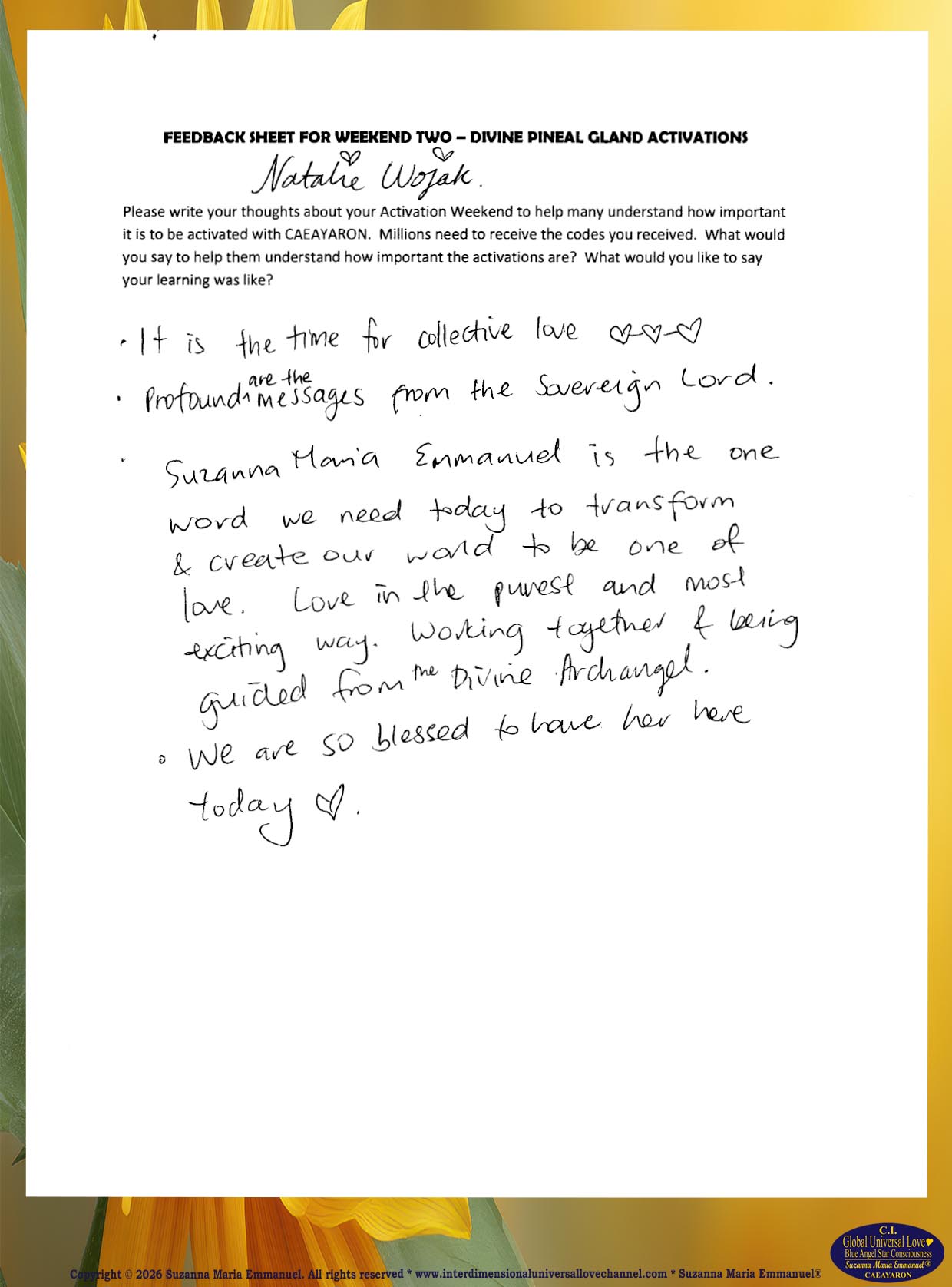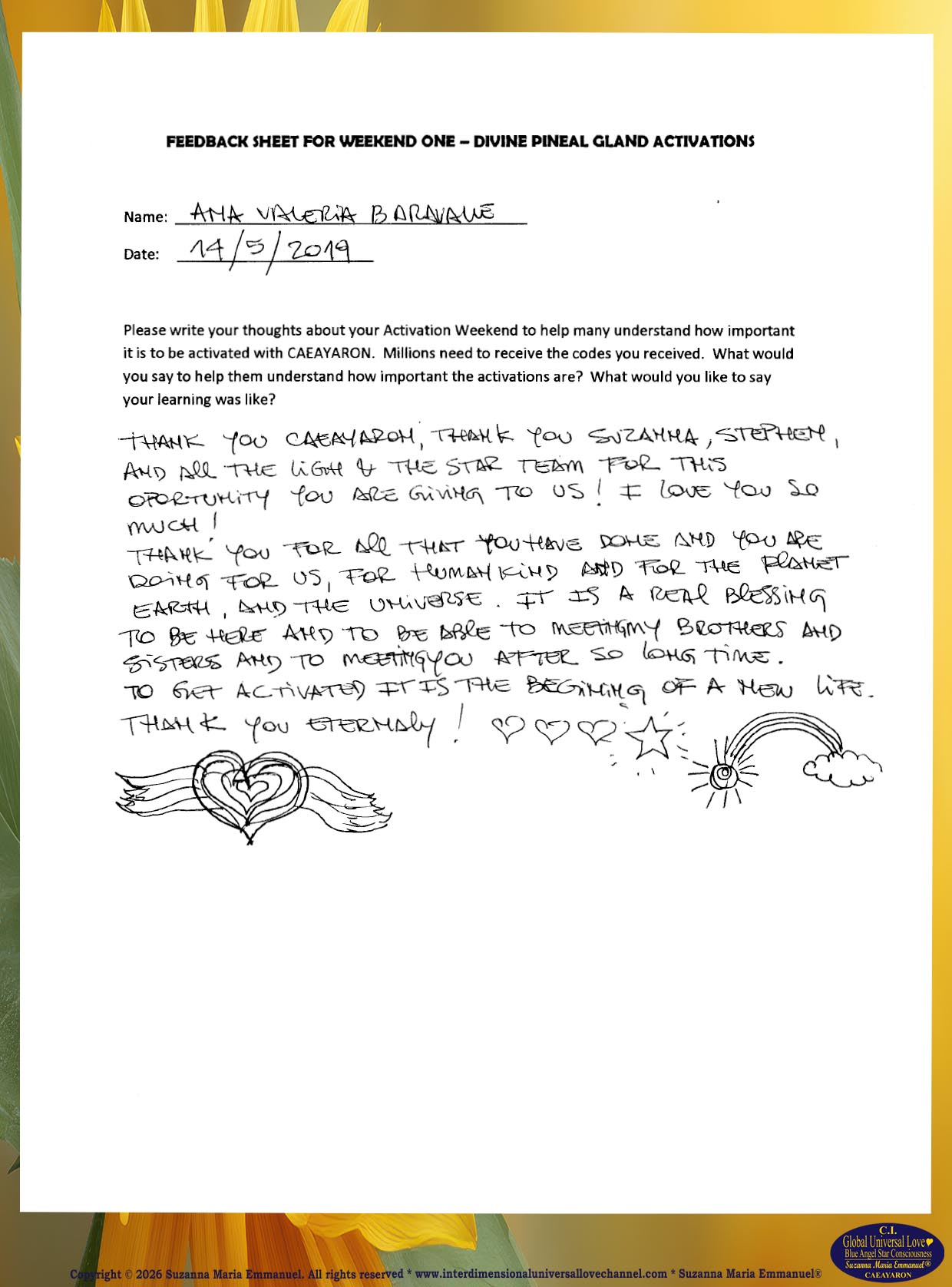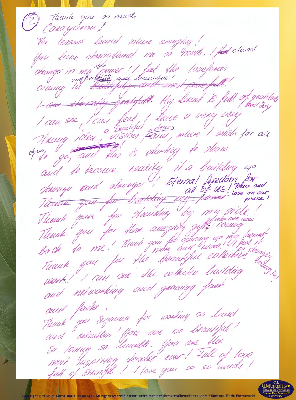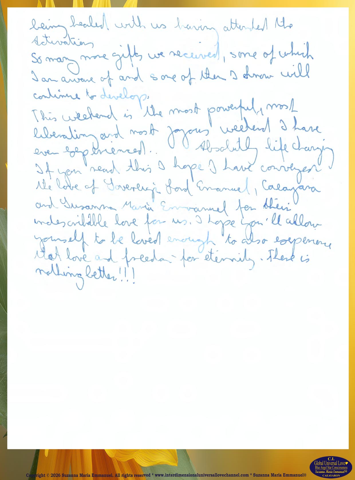 All Suzanna Maria Emmanuel's Original Star Intellect Transmissions of Universal Love Star Consciousness are trademarked and they all are copyright protected with a Professional Legal Disclaimer & Indemnity, Copyright Protection, Terms & Conditions and Trademark Clause. Suzanna Maria Emmanuel®