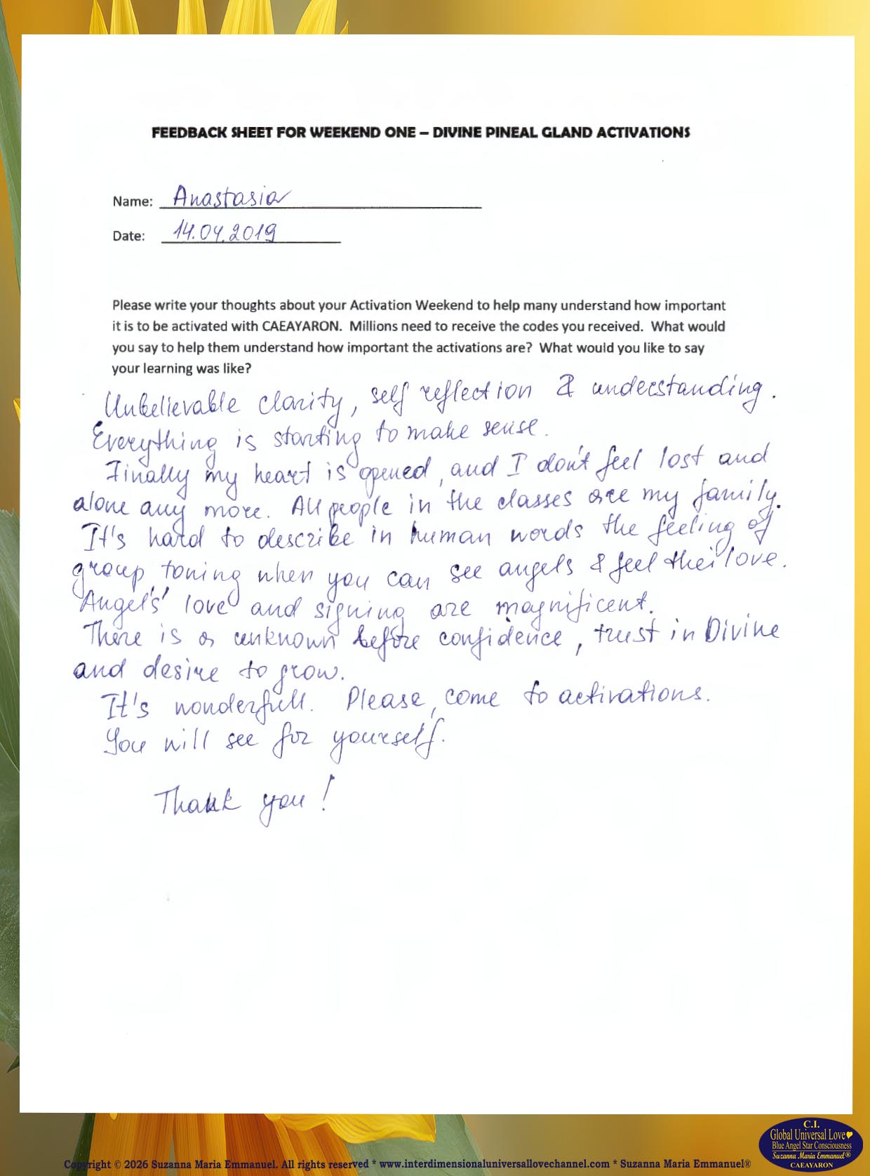 55. Testimony from Anna: The Divine and Universal Love Pineal Gland DNA Activation Events: April 2019.