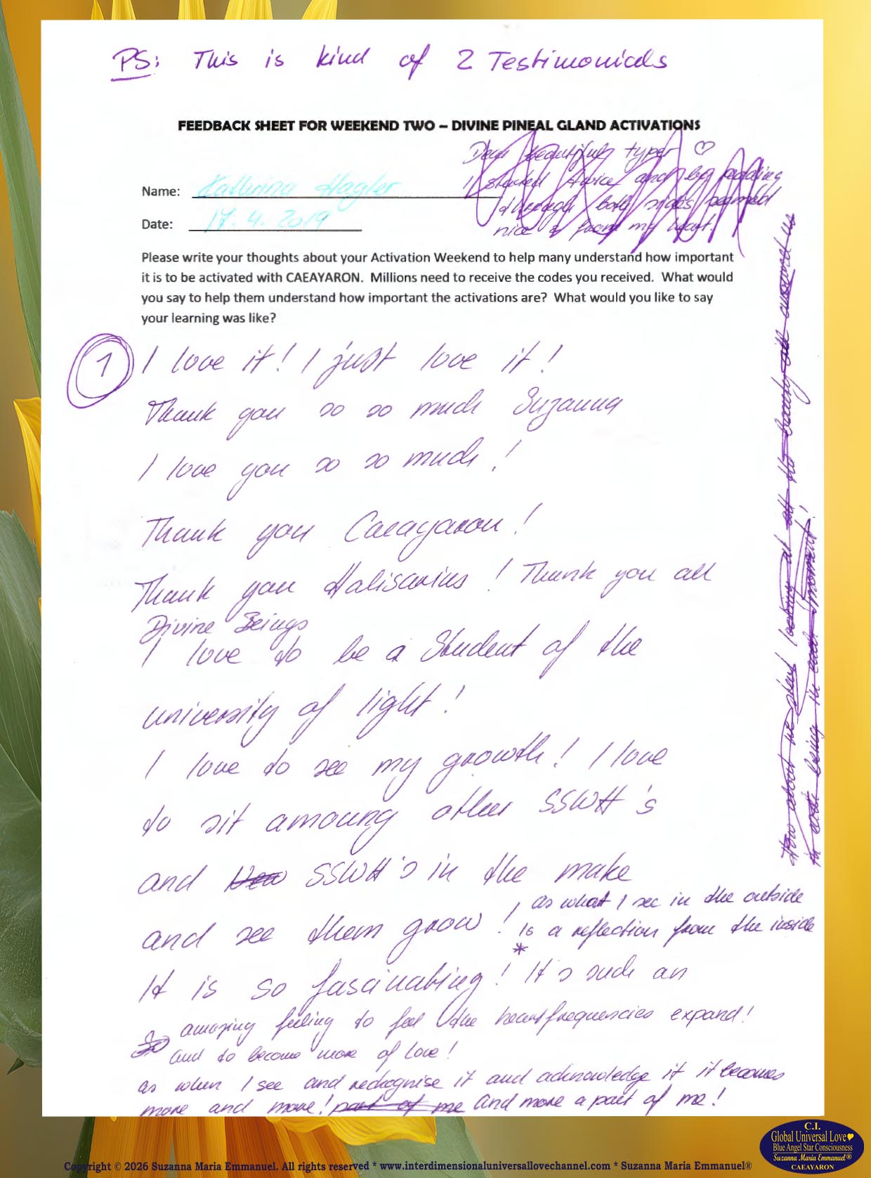 64. Testimony from Kathrina: The Divine and Universal Love Pineal Gland DNA Activation Events: April 2019, page 1.