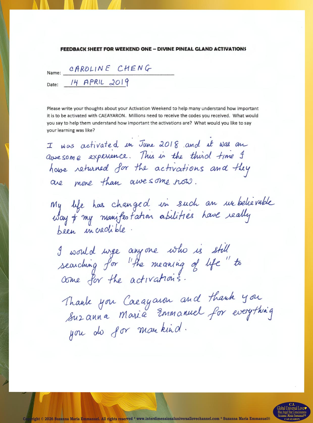 56. Testimony from Caroline: The Divine and Universal Love Pineal Gland DNA Activation Events: April 2019.