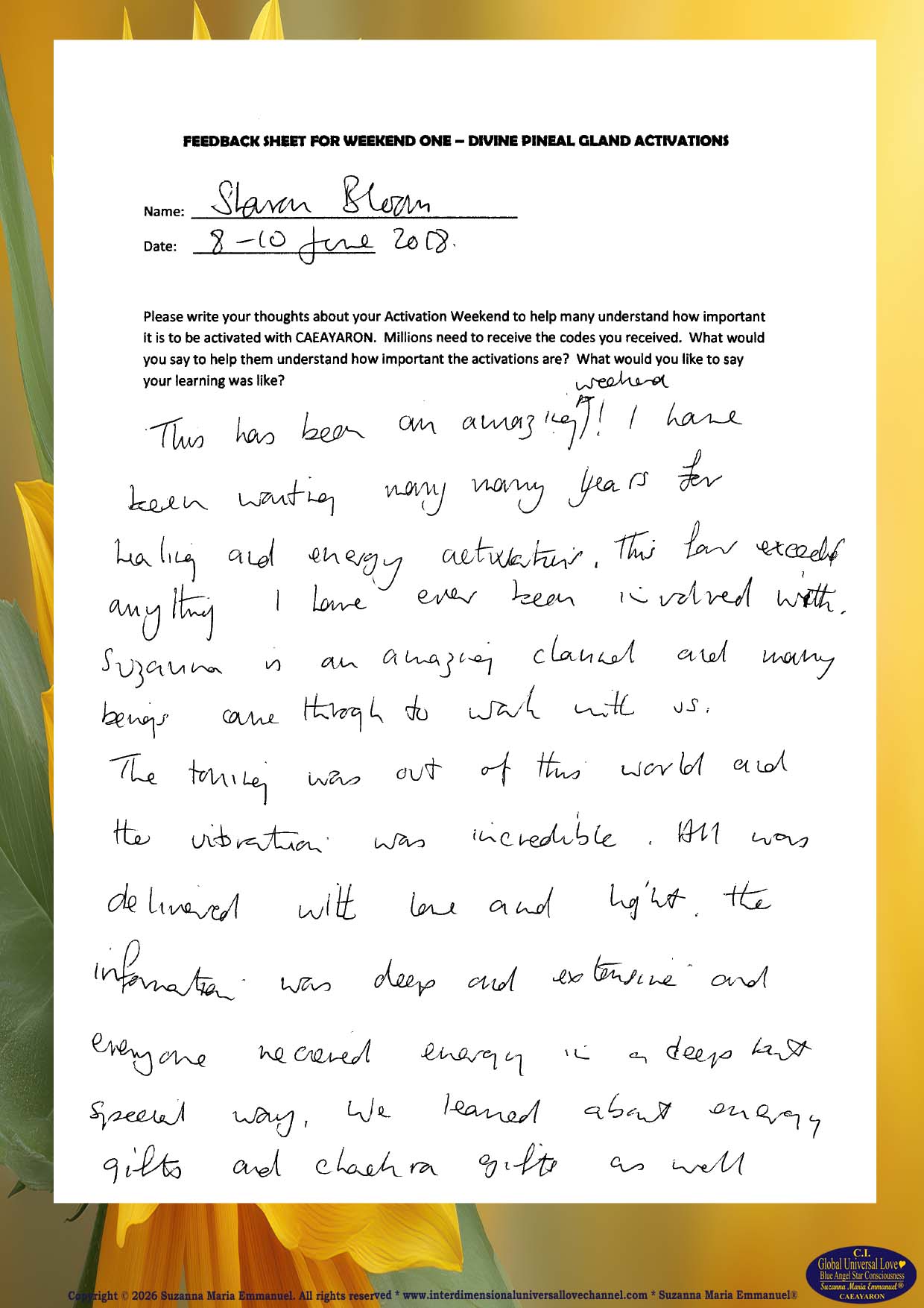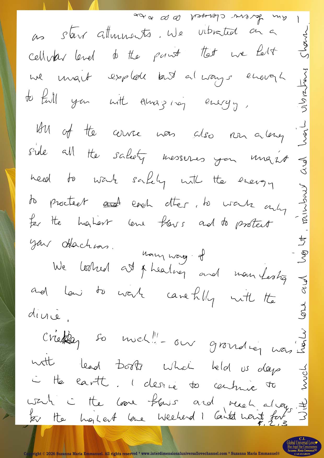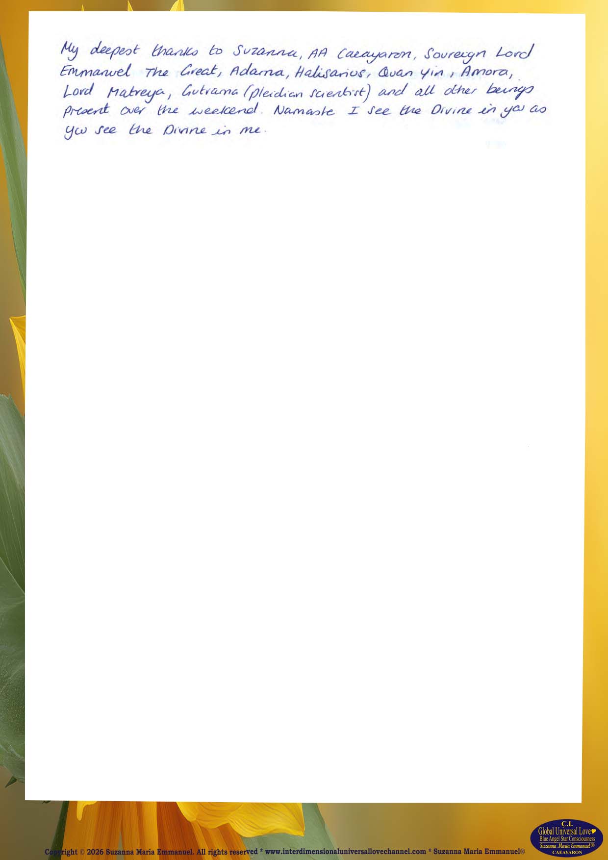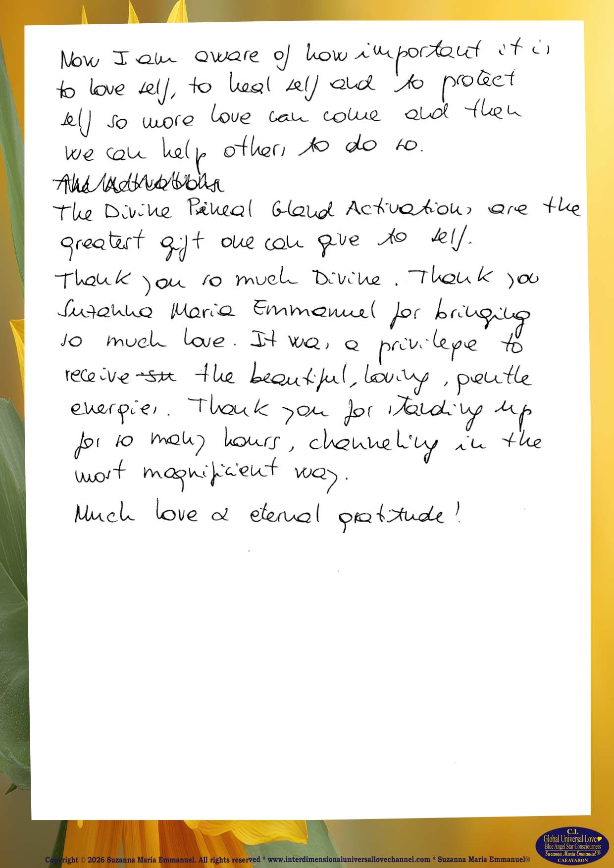 All Suzanna Maria Emmanuel's Original Star Intellect Transmissions of Universal Love Star Consciousness are trademarked and they all are copyright protected with a Professional Legal Disclaimer & Indemnity, Copyright Protection, Terms & Conditions and Trademark Clause. Suzanna Maria Emmanuel®
