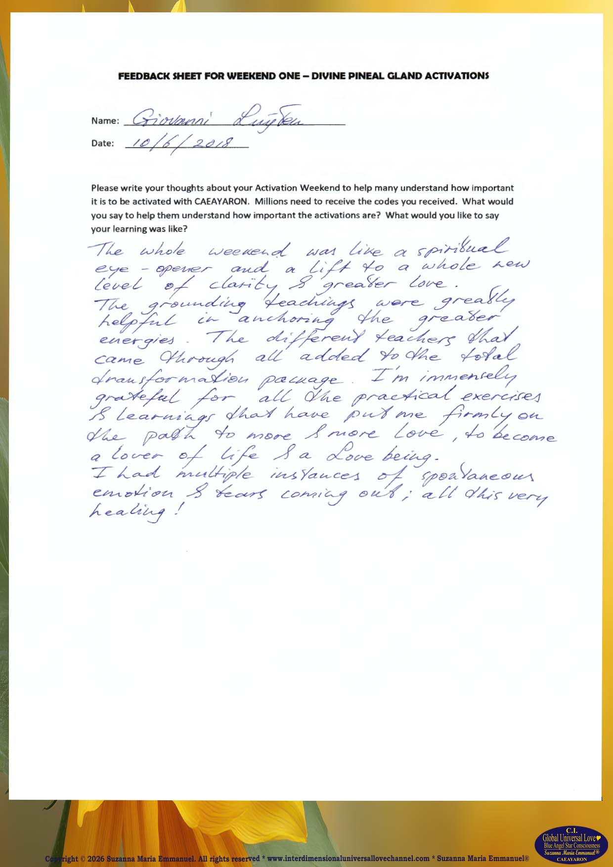 1. Testimony from Giovanni: The Divine and Universal Love Pineal Gland DNA Activation Events: June 2018.