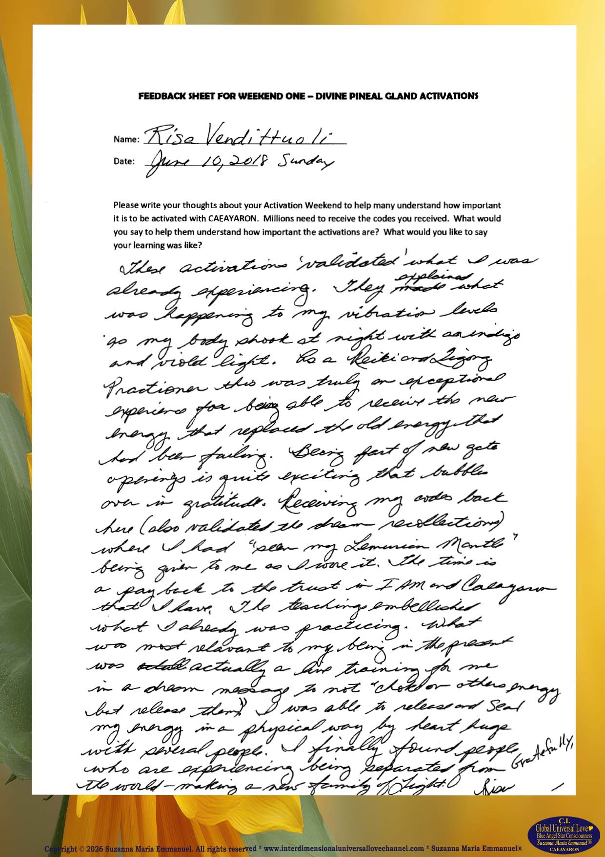 Testimony from Monica, Page 2: The Divine and Universal Love Pineal Gland DNA Activation Events: June 2018.