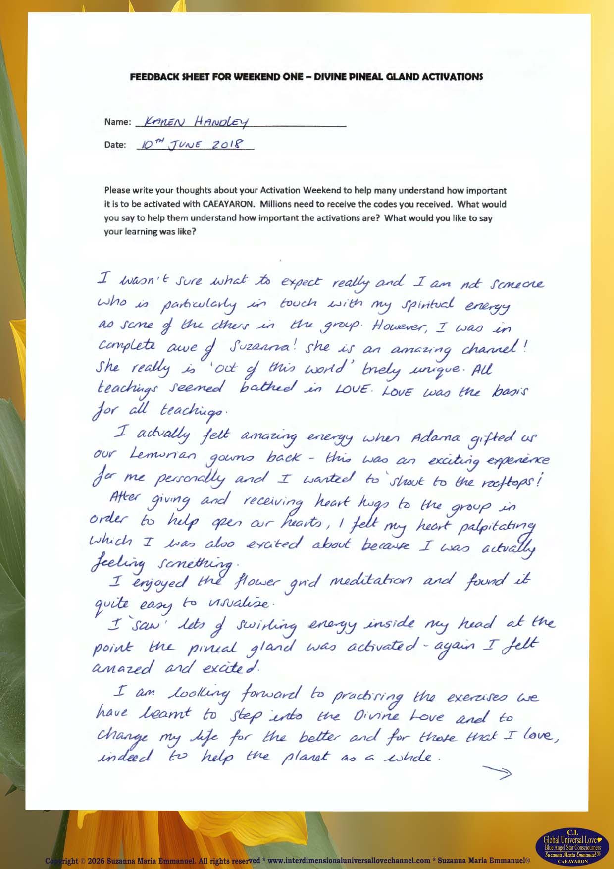 Testimony from Karen, Page 2: The Divine and Universal Love Pineal Gland DNA Activation Events: June 2018.