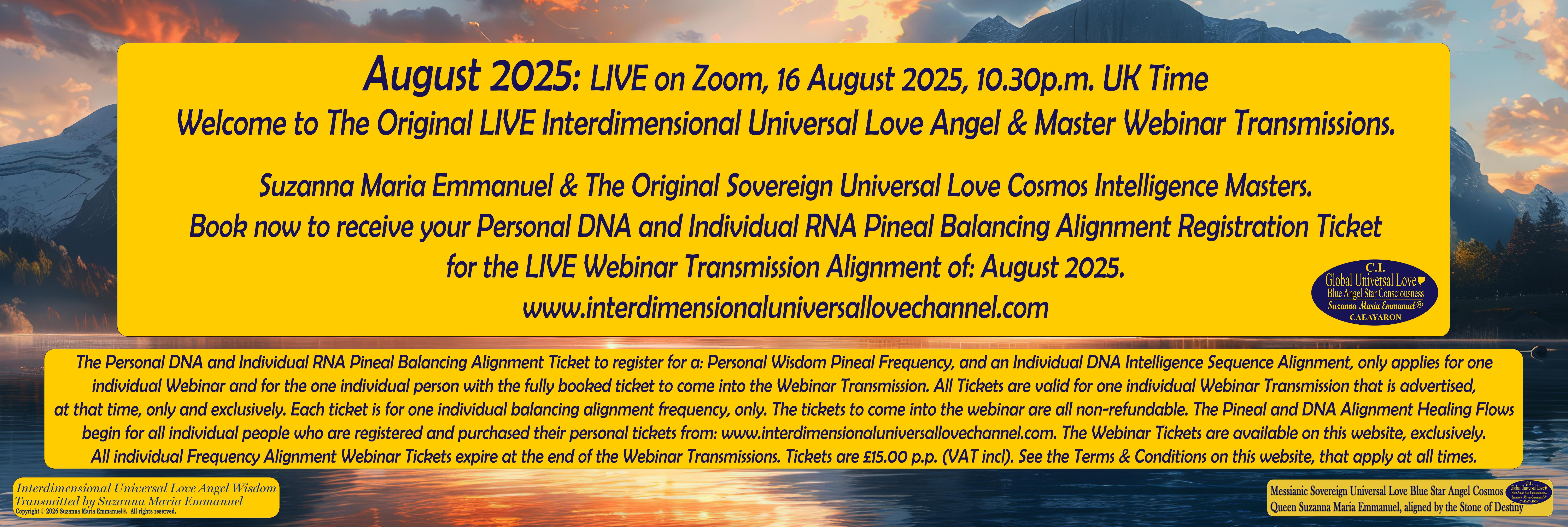 This movie was posted on this website, 3 August 2025, to show a short demonstration of the LIVE Interdimensional Universal Love Angel & Star Master Webinar Transmission. This was filmed LIVE, 19 July 2025. After the introduction, by Suzanna Maria Emmanuel, to welcome all who came to the Interdimensional Universal Love Angel & Star Master Webinar Transmission, that is when Sovereign Lord Emmanuel The Great began to speak through Suzanna Maria Emmanuel's Original Sovereign Universal Love Angel & Star Master Channel.