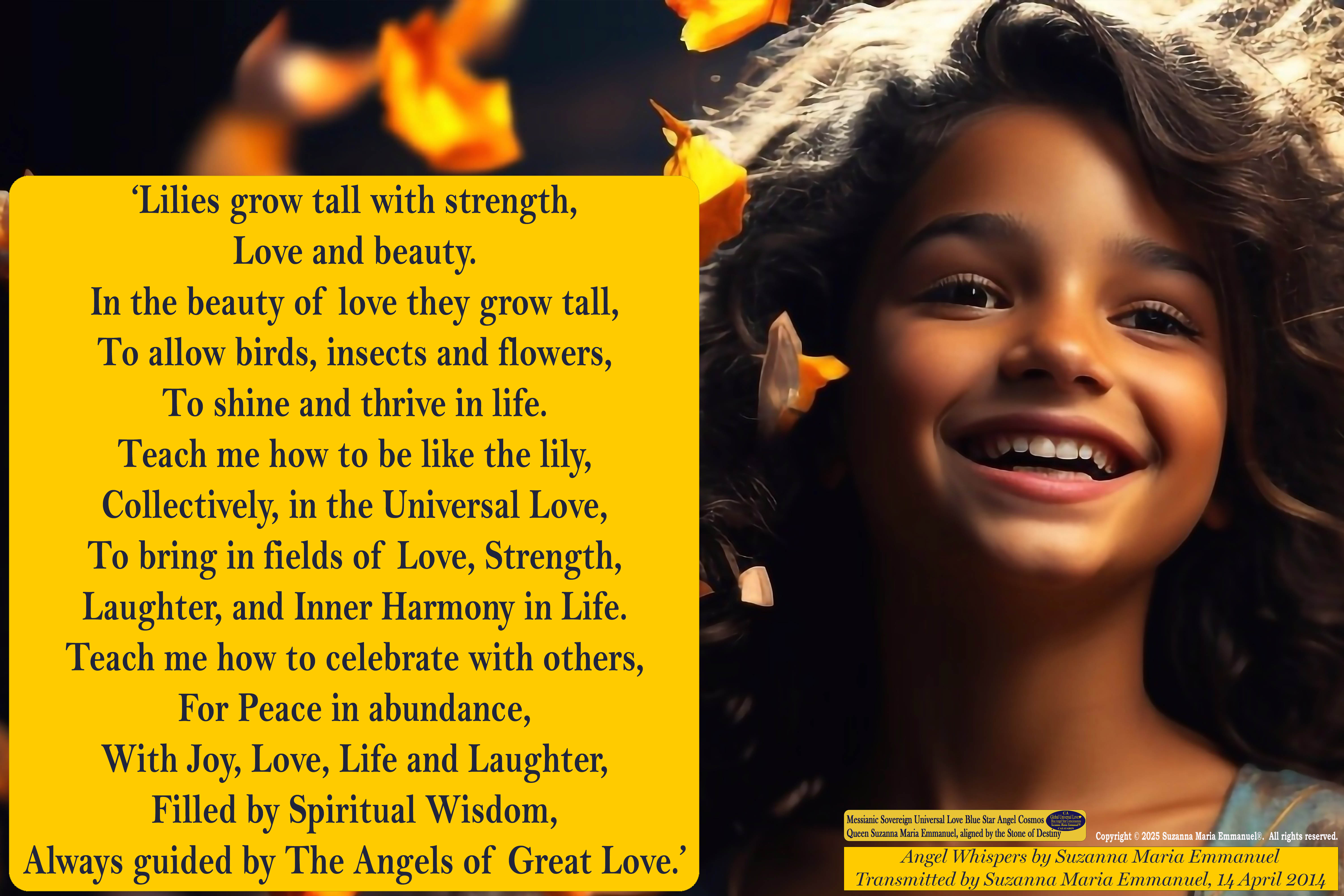 Greetings. My name is Suzanna Maria Emmanuel. I am the Original Designated Sovereign Universal Love Golden Sun & Blue Star Angel Channel and Messenger.