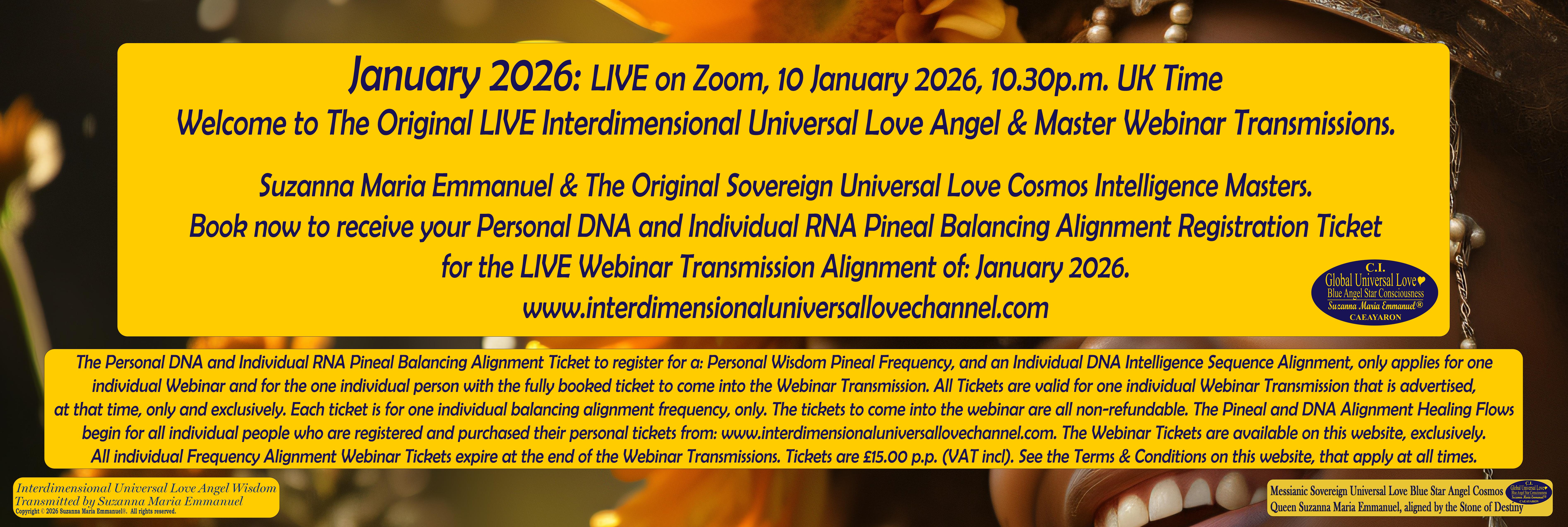 The Saturday evening, Interdimensional Universal Love Angel & Star Webinar Transmission, held LIVE on Zoom, at 10:30p.m., 10 January 2026, is presented by: Caeayaron; Sovereign Lord Emmanuel The Great; Lord Maitreya; Archangel Haniel; Quan Yin; Ammorah; and Halisarius, channelled by Suzanna Maria Emmanuel.
