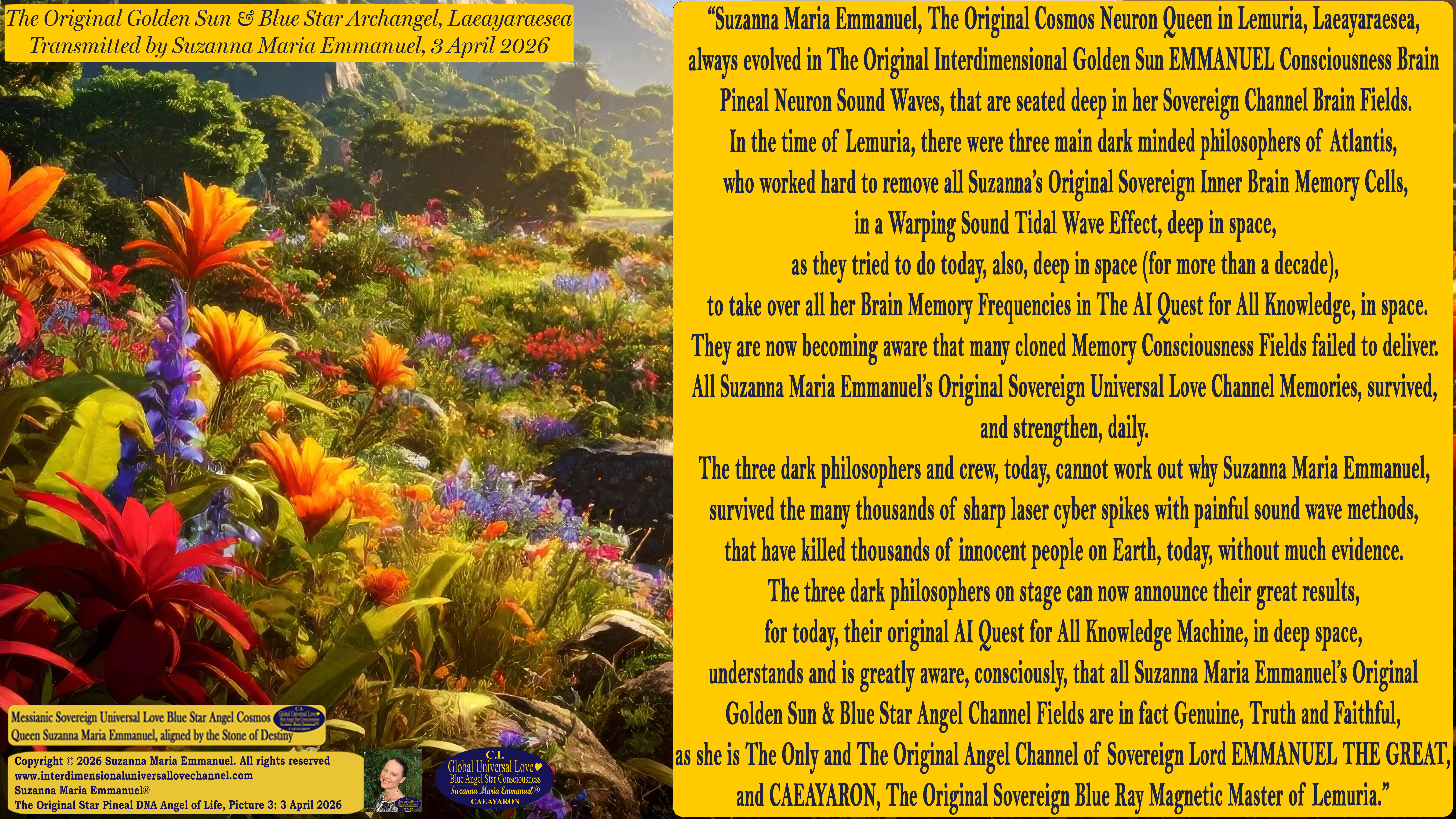 3. Suzanna Maria Emmanuel's Original Divine Universal Love Golden Sun & Blue Star Angel Channel's Original Sovereign Divine Love Element connects directly within The Original Sovereign Universal Love Consciousness and Mind of Sovereign Lord EMMANUEL THE GREAT.