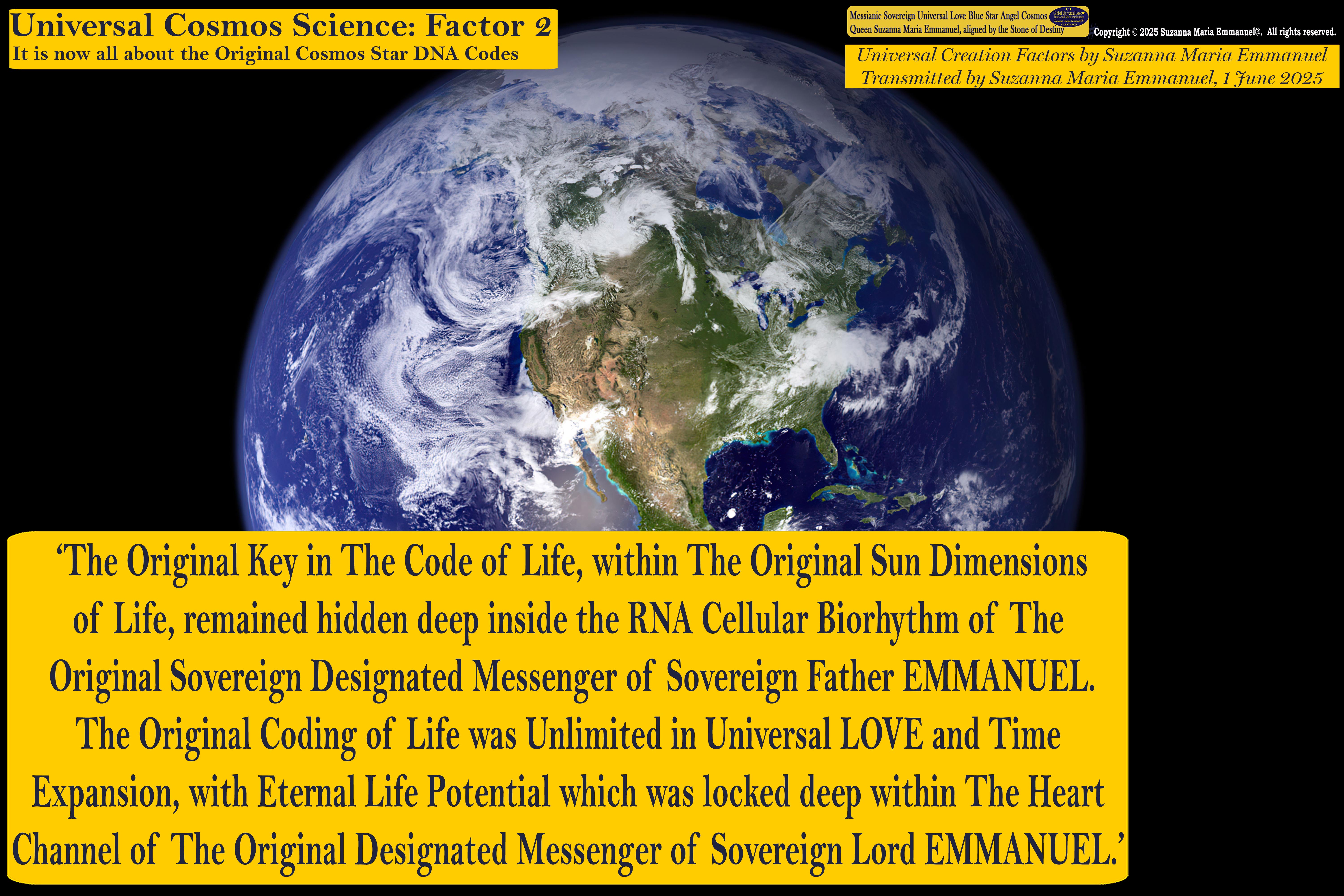 1 June 2025 - Universal Cosmos Science and Creation Factor 2: The Original Designated Sovereign Universal Love Angel Channel and Messenger of Sovereign Lord Emmanuel, is Suzanna Maria Emmanuel. She is The Original Golden Sun & Blue Star Pineal DNA Angel Channel from The Original Sovereign Star Dimensions.